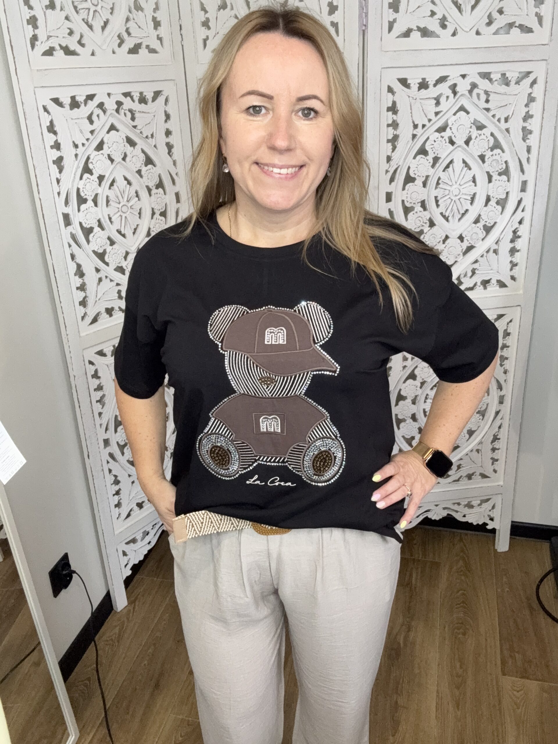 Bluzka ozdobiona błyszczącą aplikacją misia, która dodaje całości oryginalnego, modnego charakteru – subtelnego, ale zauważalnego.