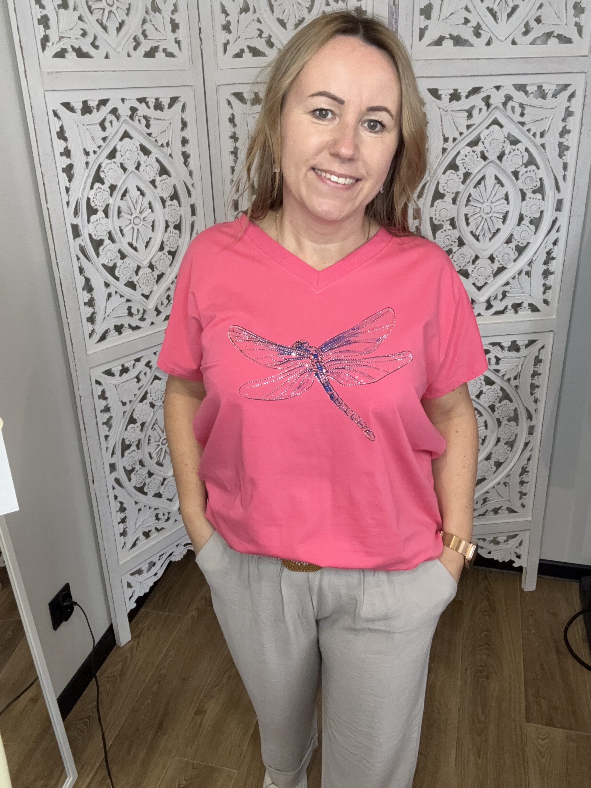 Bluzka ozdobiona błyszczącą aplikacją:
