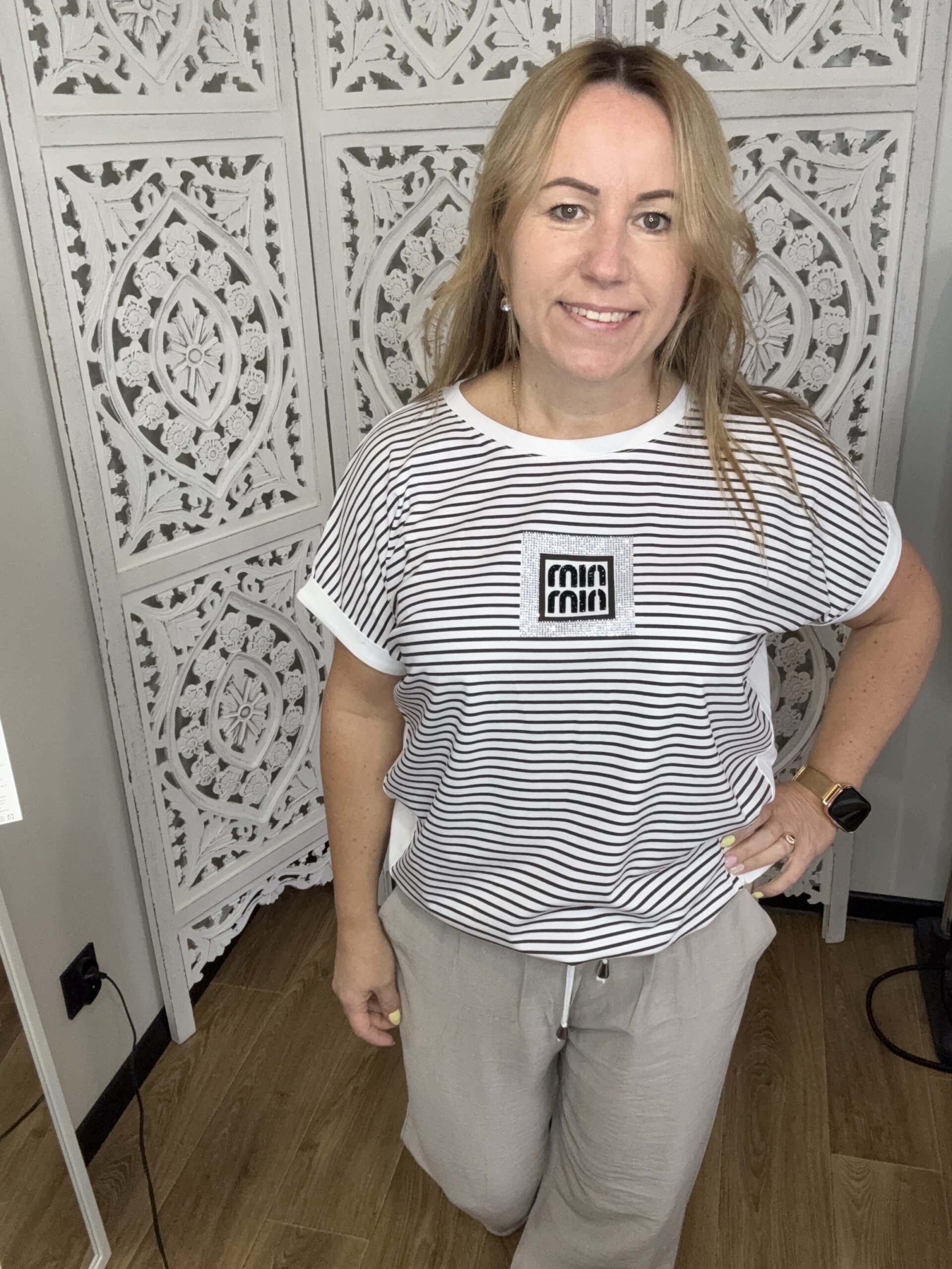 Przód bluzki zdobią delikatne paski oraz błyszcząca aplikacja z napisem MIN MIN wykonana z drobnych perełek i srebrnych elementów.