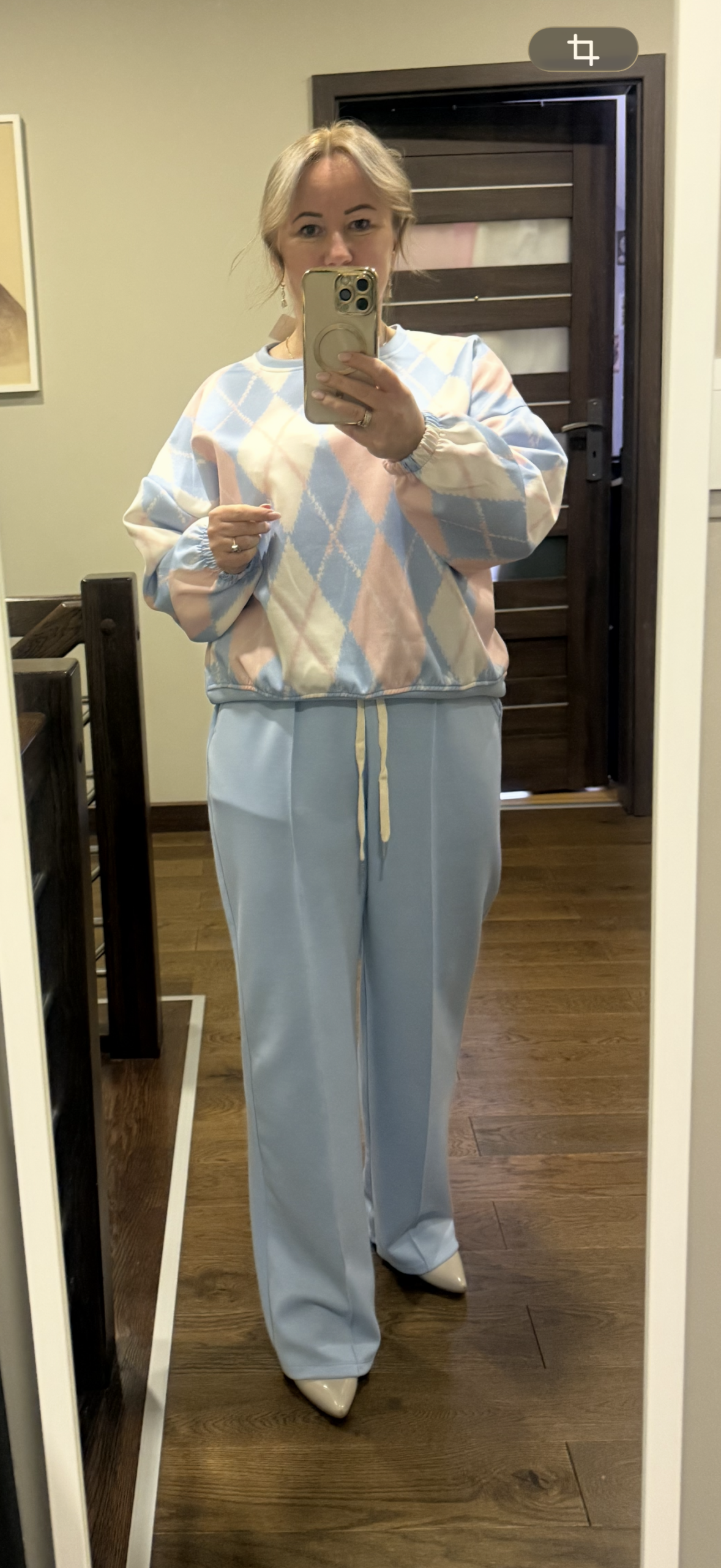 Bluza ma prosty krój i delikatny ściągacz z tyłu, co pozwala na lekkie zbluzowanie przy stylizacji. Spodnie posiadają kantkę oraz lekko rozszerzaną nogawkę, co optycznie wydłuża nogi.