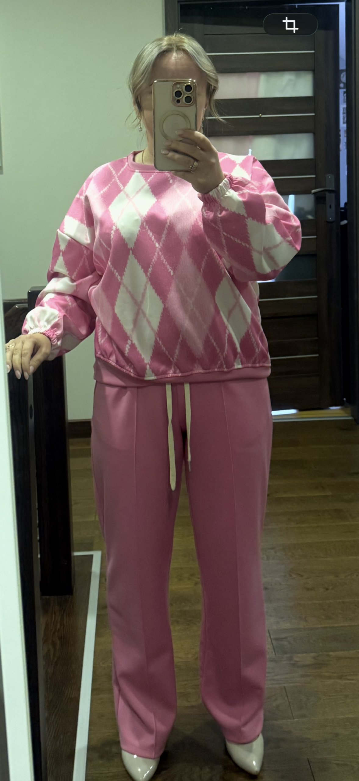 Komplet dresowy z modnym geometrycznym wzorem w romby to idealna propozycja na wiosenne spacery, wyjazdy czy codzienne stylizacje. Nowoczesny fason łączy wygodę z modnym wyglądem.