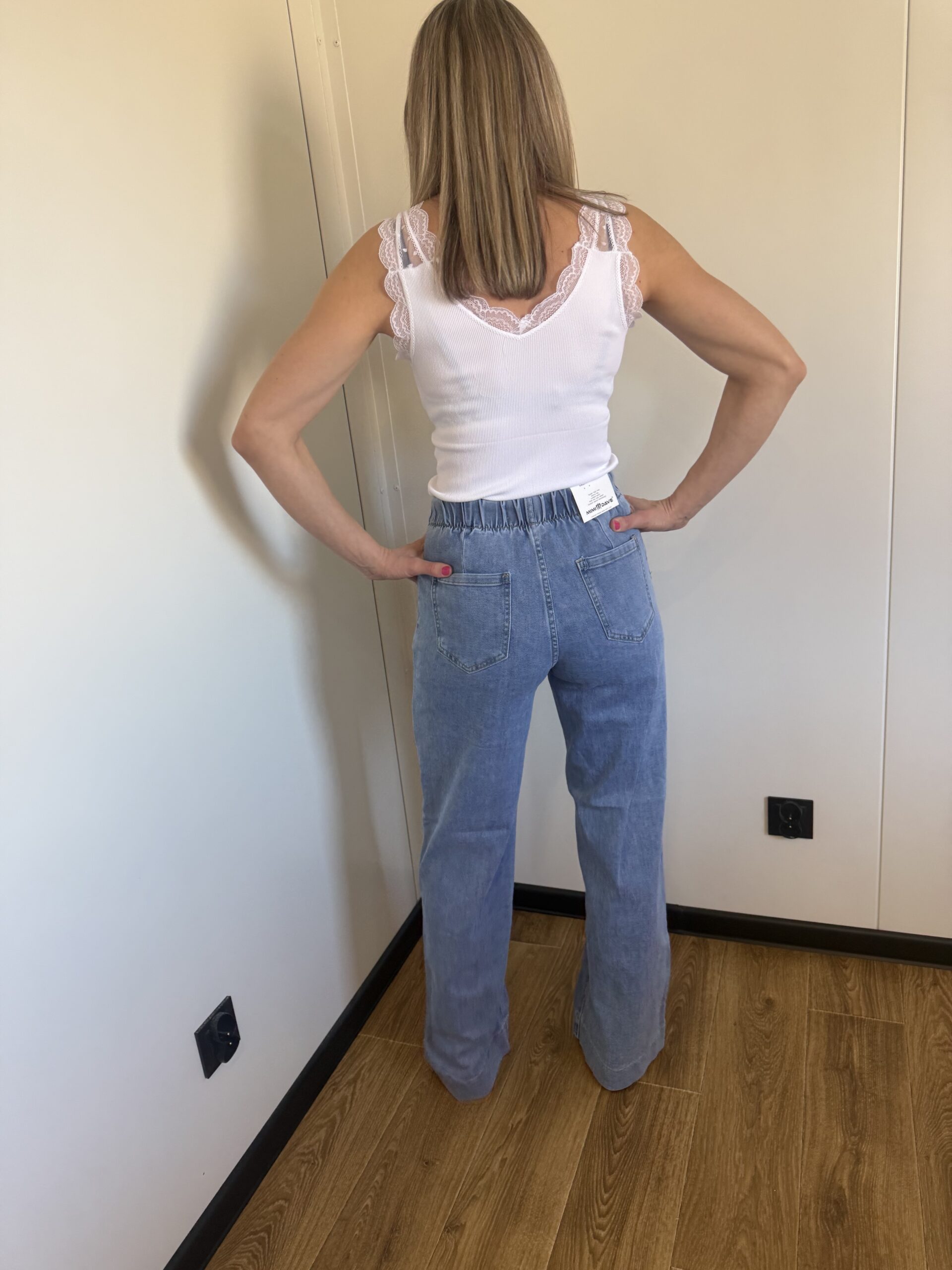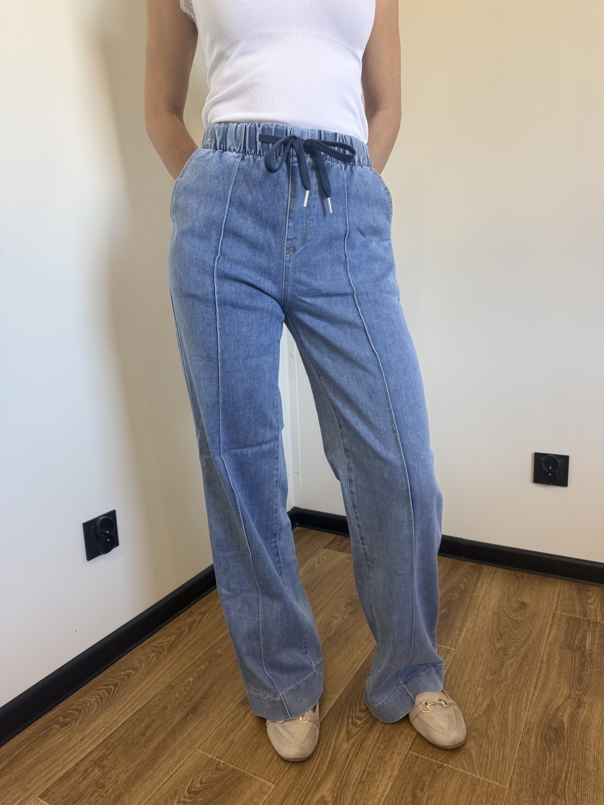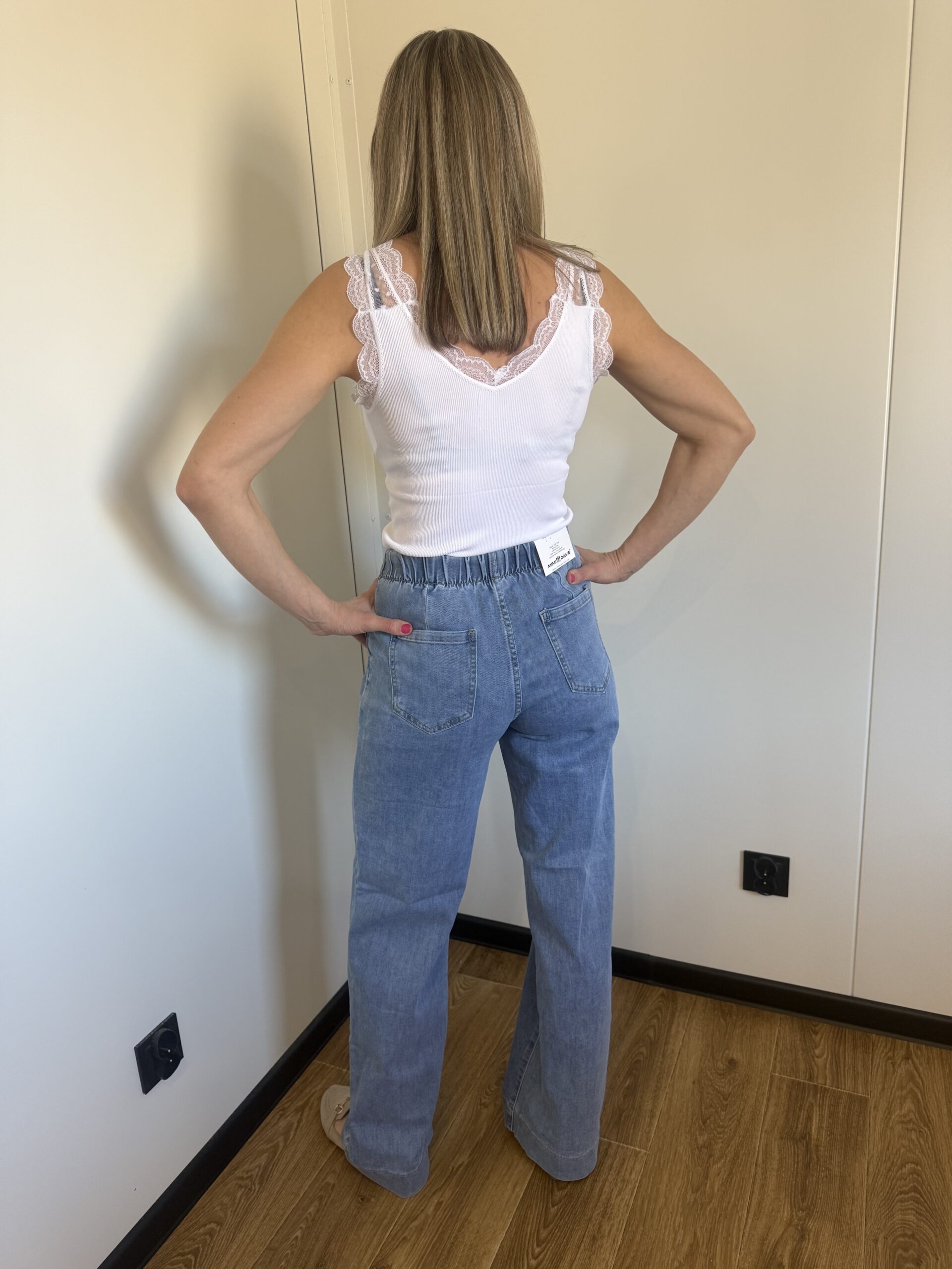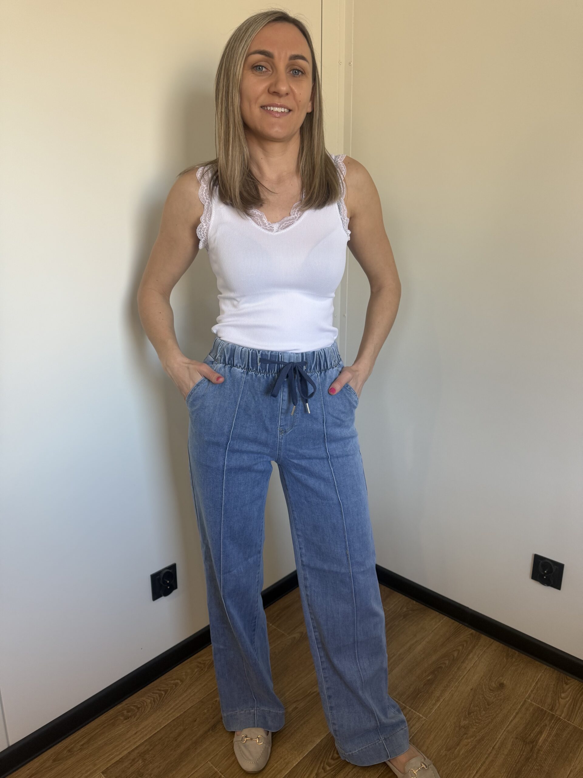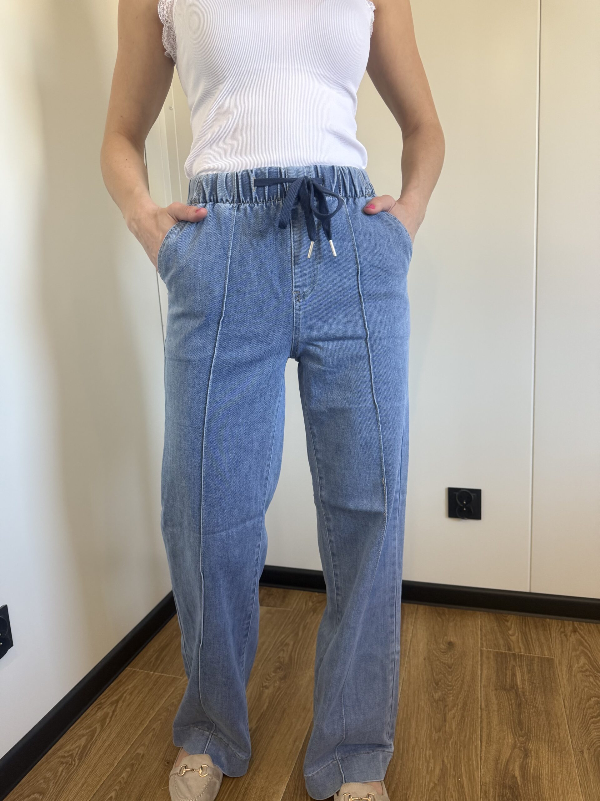 Spodnie wykonane z miękkiego, rozciągliwego materiału, który dopasowuje się do sylwetki. Gumka w pasie sprawia, że jeansy są wygodne i nie uciskają, idealnie sprawdzając się na co dzień.